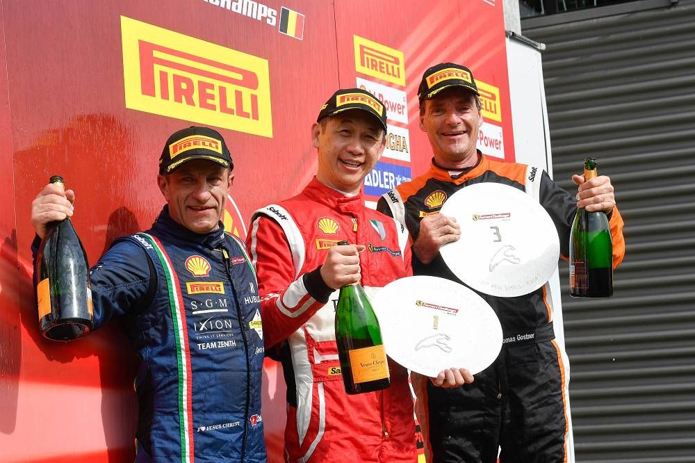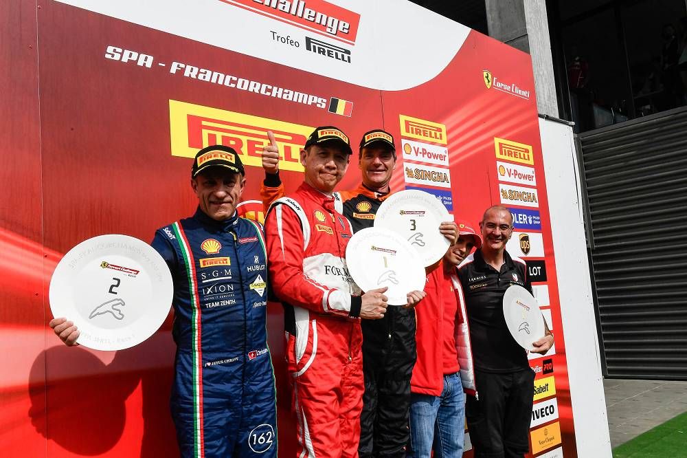 Coppa Shell. The Coppa Shell race started later in the afternoon and saw Eric Cheung (Formula Racing) hold onto first ahead of Christophe Hurni (Formula Racing) in the 488 Challenge of Team Zenith Sion-Lausanne. Thomas Gostner (Ineco-MP Racing) was in third, immediately followed by a tough group formed by Fons Scheltema (Kessel Racing), James Weiland (Rossocorsa) and Manuela Gostner (Ineco-MP Racing). Gostner attacked Weiland, who was forced to retire after a slight contact at the La Source hairpin. At the midway point the race was neutralised with the Safety Car coming on following an accident involving Vladimir Hladik (Baron Motorsport). The 488 Challenge of the Czech driver, who emerged unscathed, lost some liquid and the race finished behind the safety car. Cheung took first ahead of Hurni and Thomas Gostner.