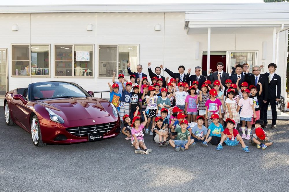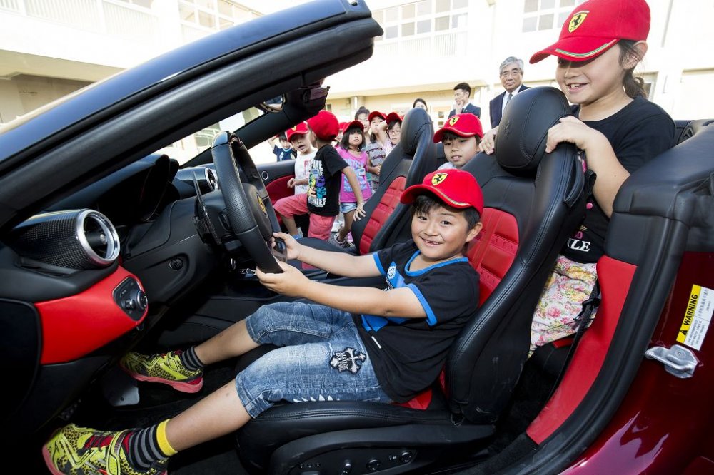 As part of the event, the children were allowed to admire and then take turns in the driver’s seat of a Ferrari California T in front of the Kaihoku and Mangokuura Junior Schools.