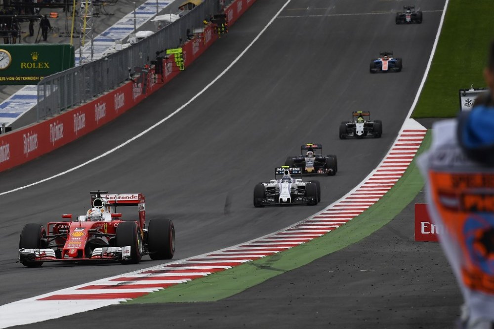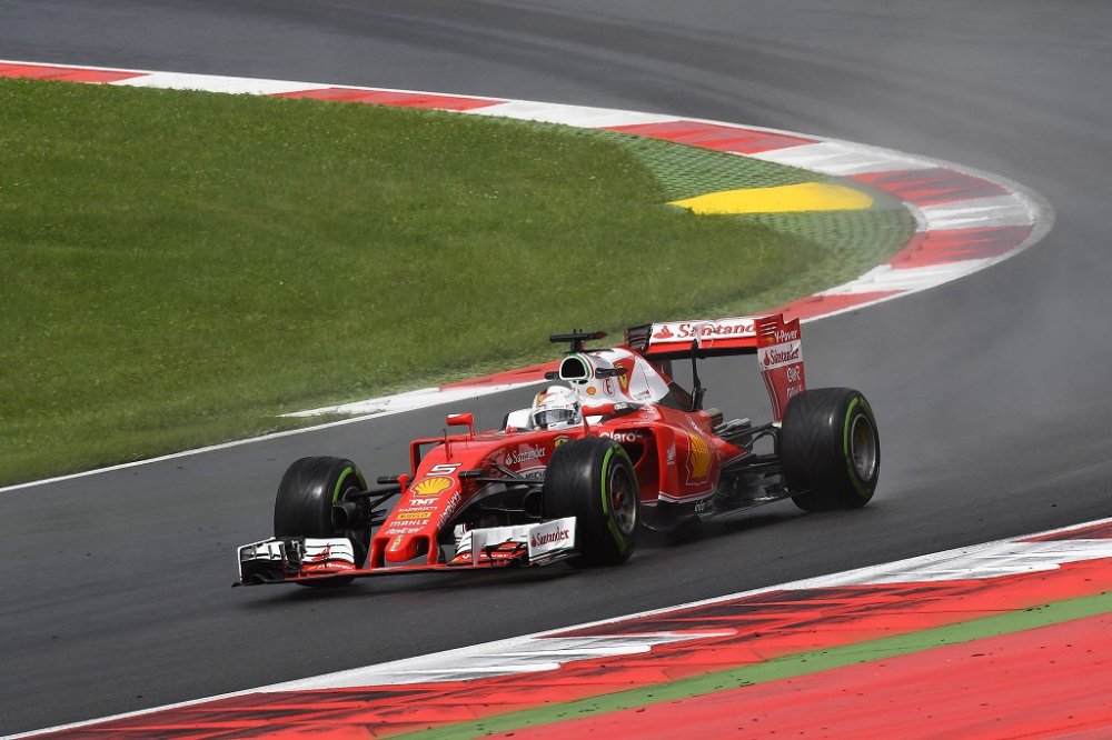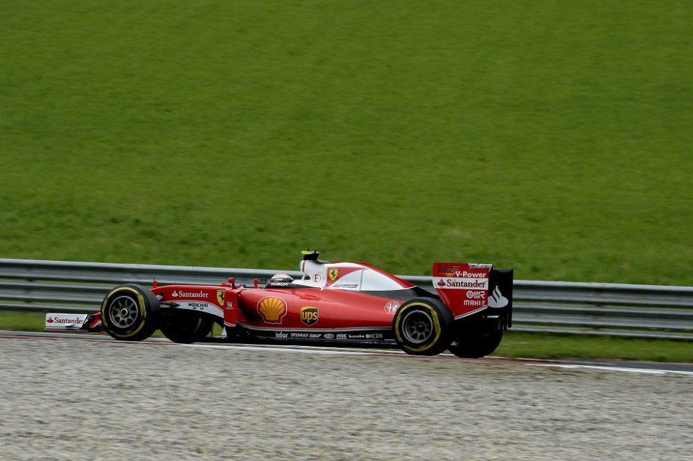 A sudden change in the weather affected the second free practice session for the Austrian Grand Prix. It started in sunshine, but after just ten minutes a torrential downpour hit the track, forcing everyone to wait it out in the pits for around half and hour, before heading back out again on Intermediate tyres. Before the rain, both Ferraris had completed a run on the Supersofts. In the final stages, on the Ultrasoft, Kimi Raikkonen set the eighth fastest time in 1.08.820, while Sebastian Vettel, on a long run, ended up with a best lap of 1.08.589, set on Supersofts, but only managed four laps on his final run, when he spun into the gravel at turn 2. Yet again, the fastest times were set by the Mercedes duo of Nico Rosberg (1.07.967) and Lewis Hamilton (1.07.986.)