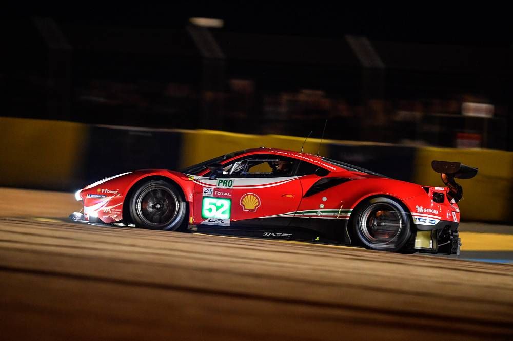 GTE-Pro. The race of the Ferrari crews in GTE-Pro class was immediately affected by incidents. A puncture during the third hour forced James Calado to limp from the Michelin chicane to the pits, losing practically a lap. The first Safety Car phase then split the group into three sections, with Porsche no. 92 out on its own behind Safety Car A, all the rest of the GT cars stuck behind Safety Car B car and no. 51 behind the third Safety Car. This cut world champions Calado and Pier Guidi along with Daniel Serra out of the leading group. During the following neutralisation, car no. 71 found itself with a damaged front splitter due to debris from another car and lost a few laps for repairs. The 488 GTE stayed in the race and crossed the finish line in tenth place, earning championship points. Antonio Giovinazzi, Pipo Derani and Toni Vilander in car no. 52 benefited from the Safety Car, moving up into second. During the night Calado, Pier Guidi and Serra lapped like metronomes rising to sixth position before dropping back to eighth due to a shock absorber problem. However, this finish was worth fifth place in terms of points, as only cars entered in the FIA World Endurance Championship are elegible for. Car no. 52, on the other hand, suffered three stops&go’s for speeding in the slow zone and the pits but finished in sixth. Victory went to Christensen-Estre-Vanthoor in the Porsche no. 92.