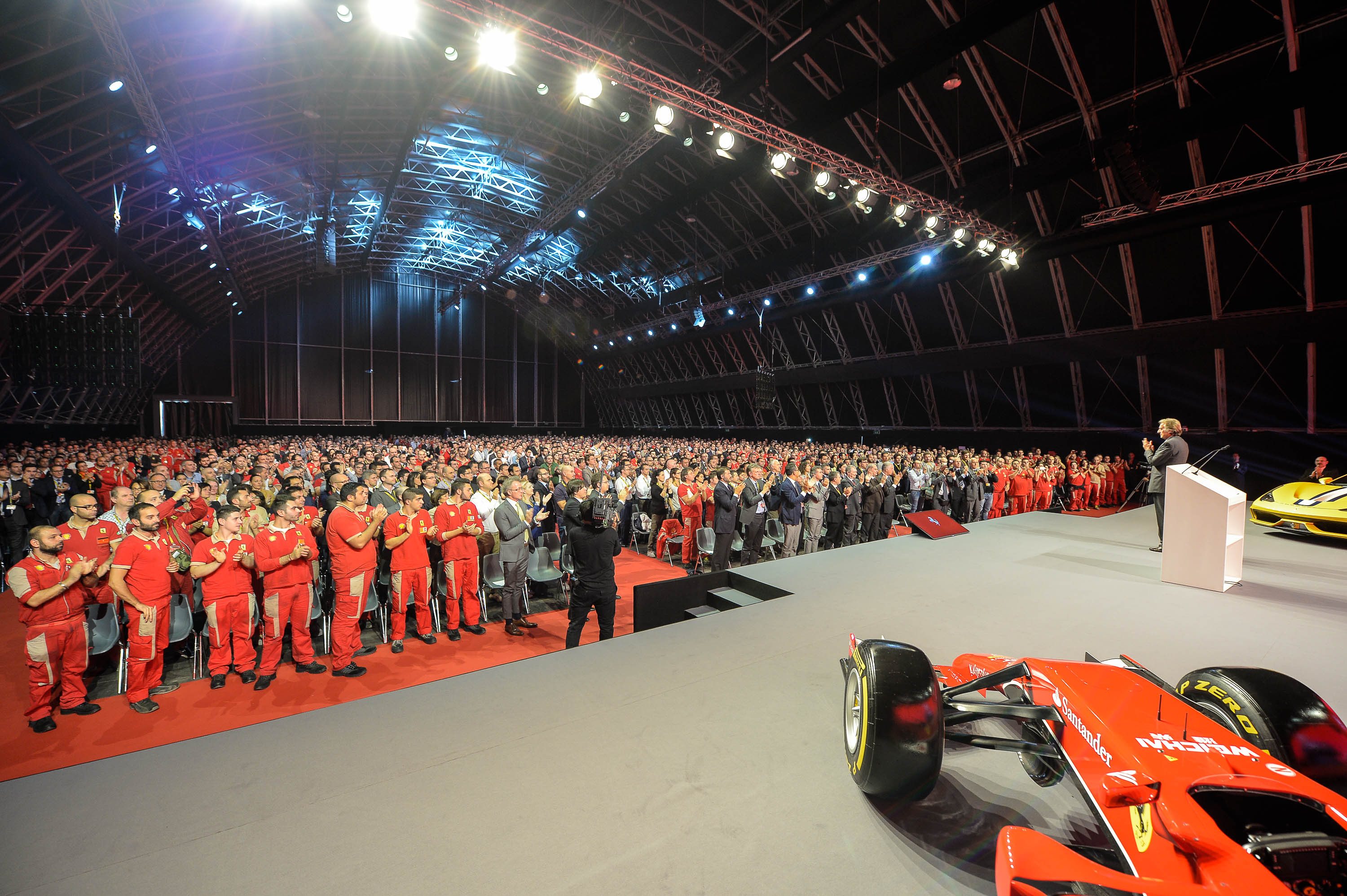After Mr Montezemolo’s address, representatives of the women and men from the factory joined him on the stage for a symbolic embrace. As he left, the Chairman was engulfed by a large crowd of admirers wanting to shake his hand, take selfies with him and generally express their enormous affection and respect for this “enduring love story”.