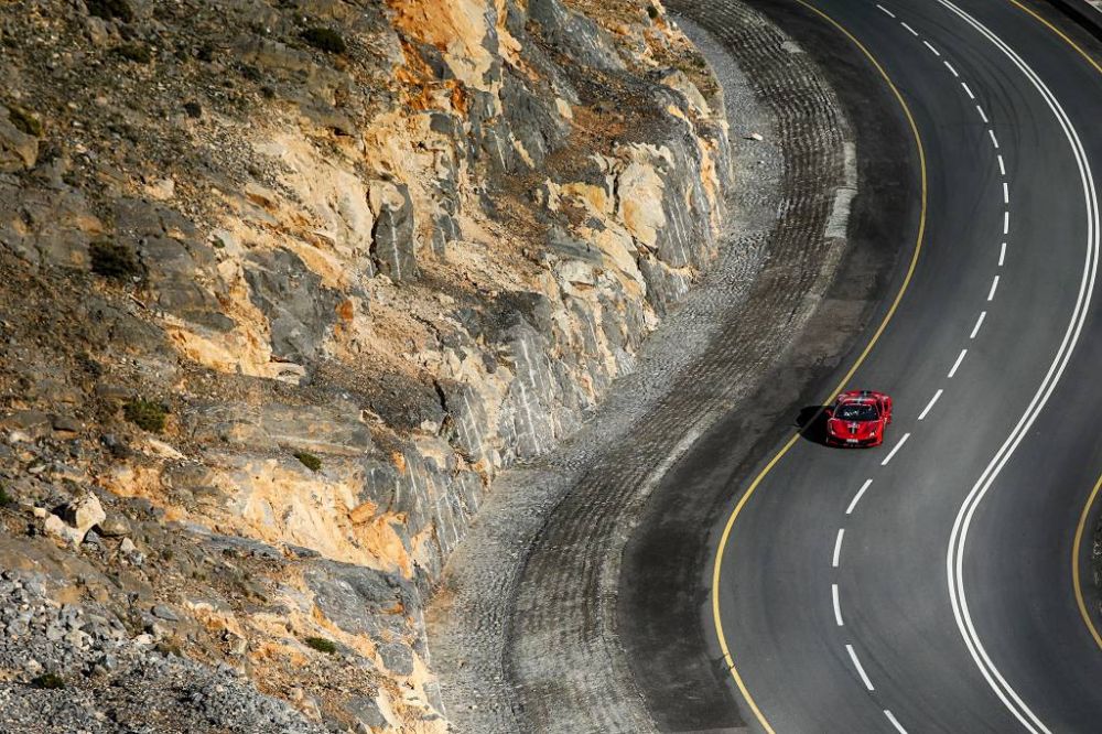 The 1,200 kilometre long itinerary, which was driven over three days, touched some of the most symbolic and beautiful areas of the Emirates. Starting from Dubai, the Ferraris tackled a series of fascinating roads that wound their way through the desert and up the hairpins of Jebel Jais mountain, making their way back for a special display at the foot of Burj Khalifa by Emaar, which was lit in the renowned red for the occasion.