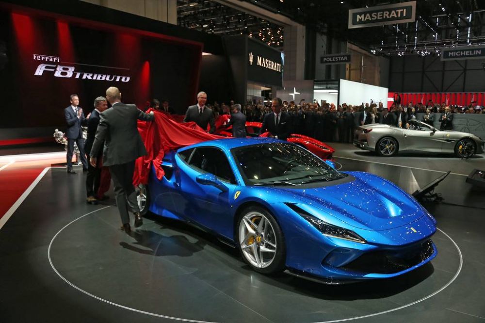Alongside the two Ferrari Tributos in Scuderia Red and Corsa Blue, a Tristrato Yellow 812 Superfast, a tailor-made Luxury Blue GTC4 and and a Glossy Aluminium Portofino are on show at the Ferrari stand at the Geneva Motor Show.
