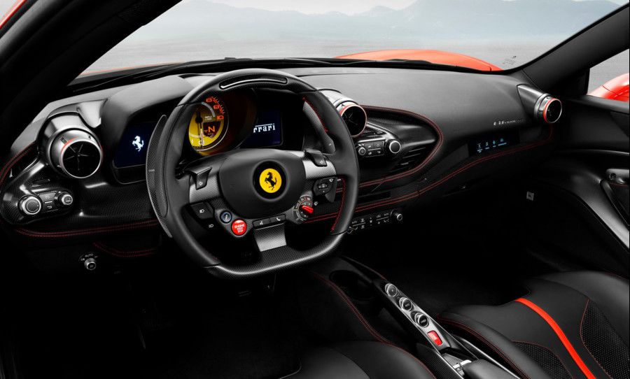 The cabin retains the classic, driver-oriented cockpit look typical of Ferrari’s mid-rear-engined berlinettas, but every element of the dash, door panels and tunnel, has been completely redesigned. The new generation HMI (Human Machine Interface), complete with round air vents, new steering wheel and controls as well as a new 7” passenger touchscreen display, significantly enhance the on-board environment for driver and passenger.